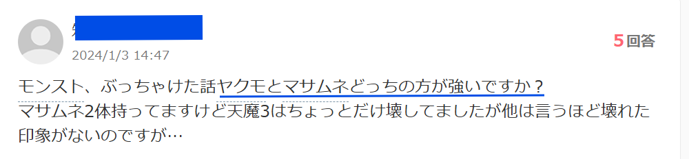 知恵袋では、「ヤクモとマサムネはどっちの方が強い?」という質問が見られました。
